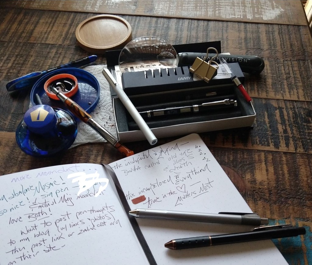 As for daily writers, a few years ago (while writing LOTs of notes) I gave up and turned to Tul (shown above.) I know Goulet Pens and other FP loyalists shudder at BP (ball point) or gel pens, but OMG these attractive inexpensive Tul pens make fast writing a pleasure. I was given one at a journaling session and have bought many since then. (I’m not affiliated with Tul or any product and have NO advertising on my blog.) For fast, reliable never-blotchy no-fuss notes and journaling, Tul pens– BP or gel– are perfect IMHO.