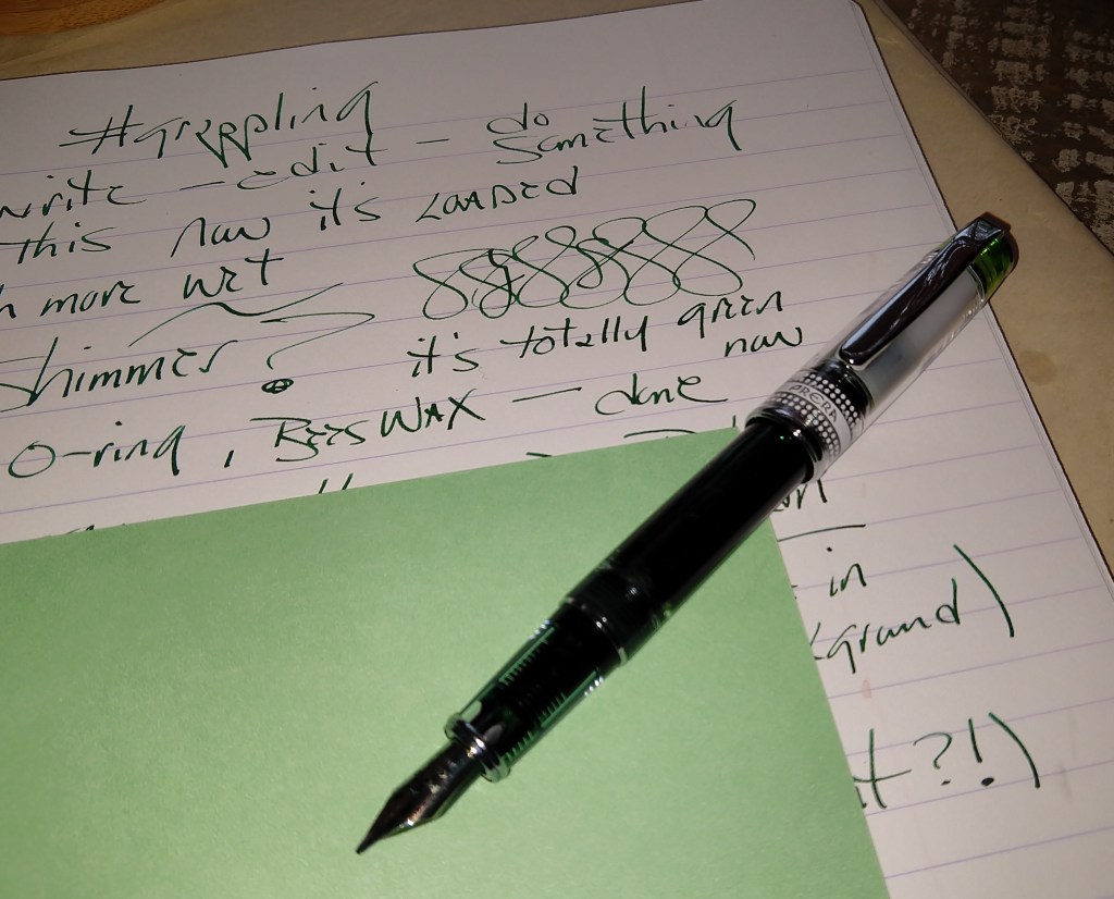 close-up to see Diamine Shimmery Ivy green ink (loaded in barrel) Posted Pilot Prera with barrel-fill writing on Clairefontaine paper. Yikes, clipped the pic which says NO O-ring only dab of beeswax on the threads. Works GREAT. Love it!