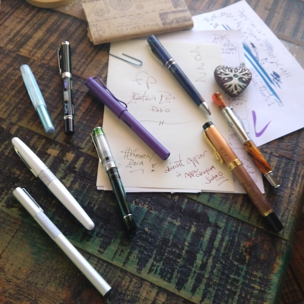 Top left 1970s Lady Scheaffer (XF), new Chinese Wingsung (F), 2 vintage “bladder” pens: a Scheaffer and a Scout, beautiful BROWN custom acrylic, Picasso (M) with Caran d’Ache “Storm” ink and one of my many Jinhao dragon pens.