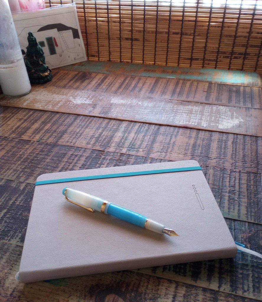Upper left is a Zebra “disposable” (that I nearly disposed of since it’s over 5 yrs old!) Not only does it work, it’s smooth. Then old to new: my beloved Monteverde “tiger eye” (purchased new in 1995 at a local pen show), my new 2022 silver metal Japanese Muji pen with fabulous Herbin “Moonshadow” cartridge, plus a Jinhao “Gullor” (barely used since 2019 due to inking issues, resolved with new converter), two Tuls (described below) and my #BuJo (bullet journal.) NOTE: new limited Lamy purple “Candy” not shown, just flimsy box & red-tipped converter. Sorry.