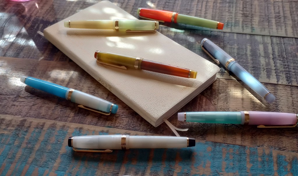 “When it comes to experimenting with pricey Frankenpens that is frightening ; ) The photo shows my inexpensive J82s: instead of Moonlight over Ocean, think Sun over Grass, Fuki Light with Rikyu tea ink, Reverse Nuts, Gray Crane, Cloudy Sky instead of Pelikan Pastel (M200), willow-ish and finally No Moon not Snow Moon. FUN and they all have related inks and variety of nibs.” ENJOY!