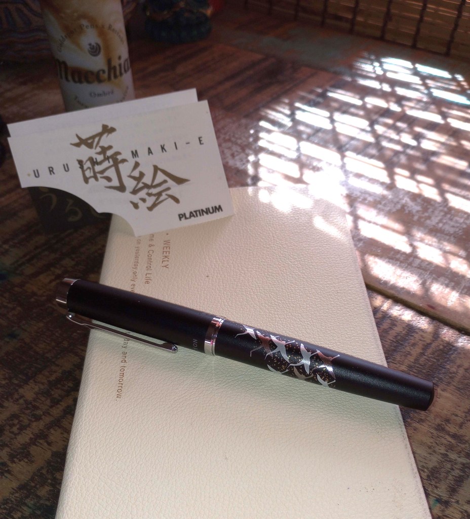 This, pen pals, is a “modern Maki-e” finish on a Platinum Procyon fountain pen. Aficionados of the Japanese art known as Urushi Maki-e will know it’s a tedious, time-consuming hand-crafted process of applying layers of materials, powders (often gold and silver dust) then lacquer. Maki-e fountain pens are one-of-a-kind works of art and command high prices.