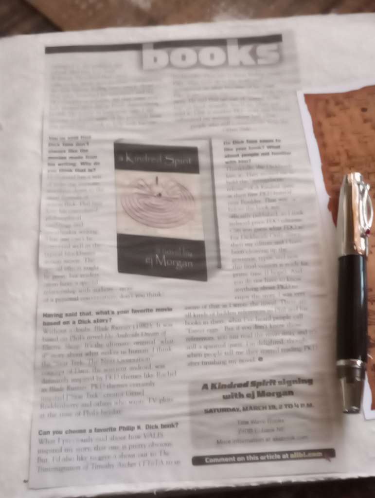 While searching for some other memorabilia, I found this review of my novel with notice of a book signing. This makes me smile. Here’s a link to the actual review from our alternative local paper called the Alibi back in 2011. The photograph I took today is blurry and the link is showing REALLY LARGE images, but scroll down and the text is legible. The reporter, John Bear, was a SF guy and knew a lot about Philip K. Dick. This is the second page of a two-page spread… the first page had DICKHEAD in huge font. Check it out.